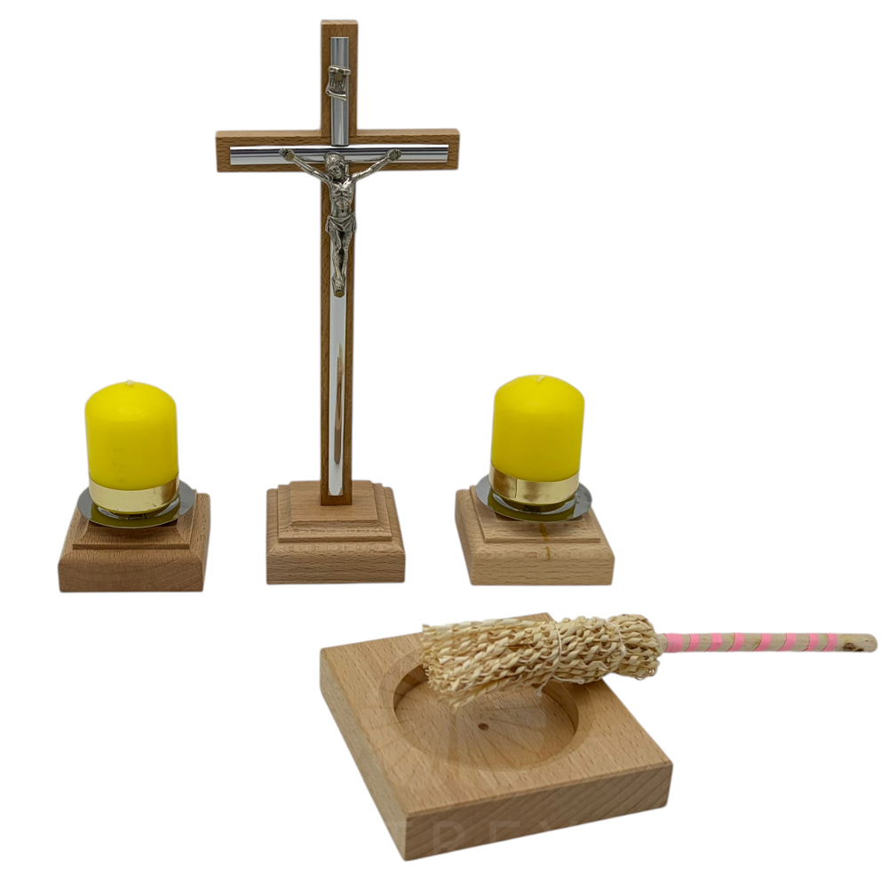 Conjunto de cruz y candeleros de altar con acetre e hisopo de madera.