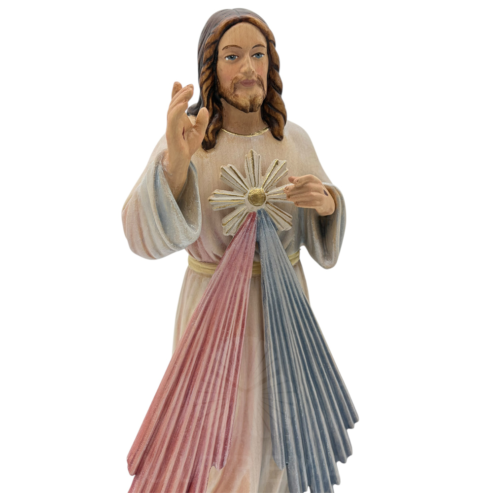 Imagen de Jesús Misericordioso con rayos de luz tallada en madera y pintada a mano.