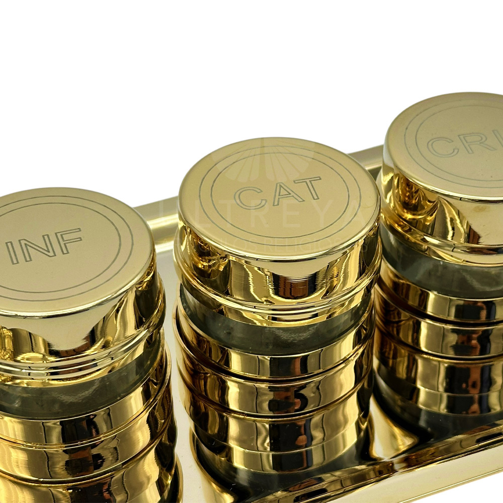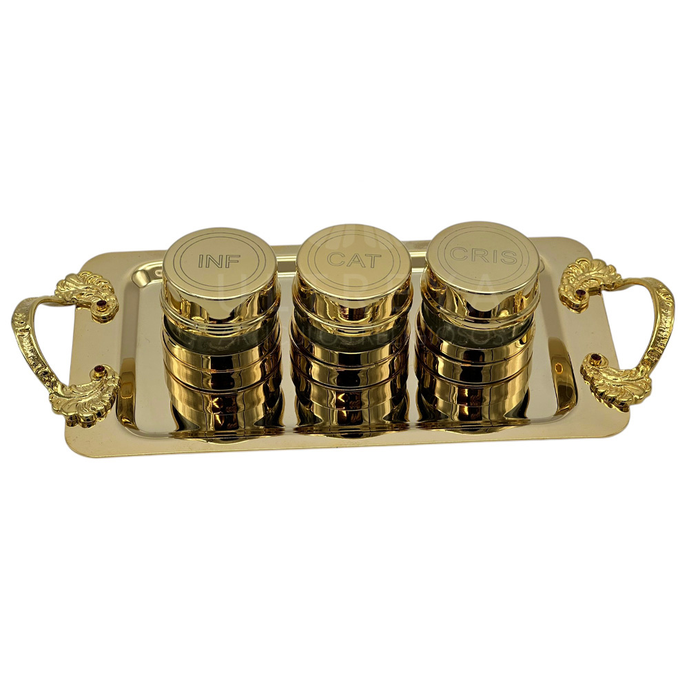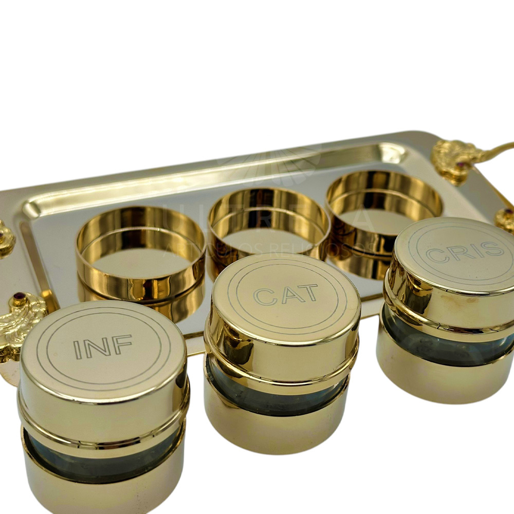 Bandeja de metal con asas bañada en oro de 24 kilates con crismeras. Las bases incrustadas en las crismeras garantizan una completa estabilidad de los frascos.