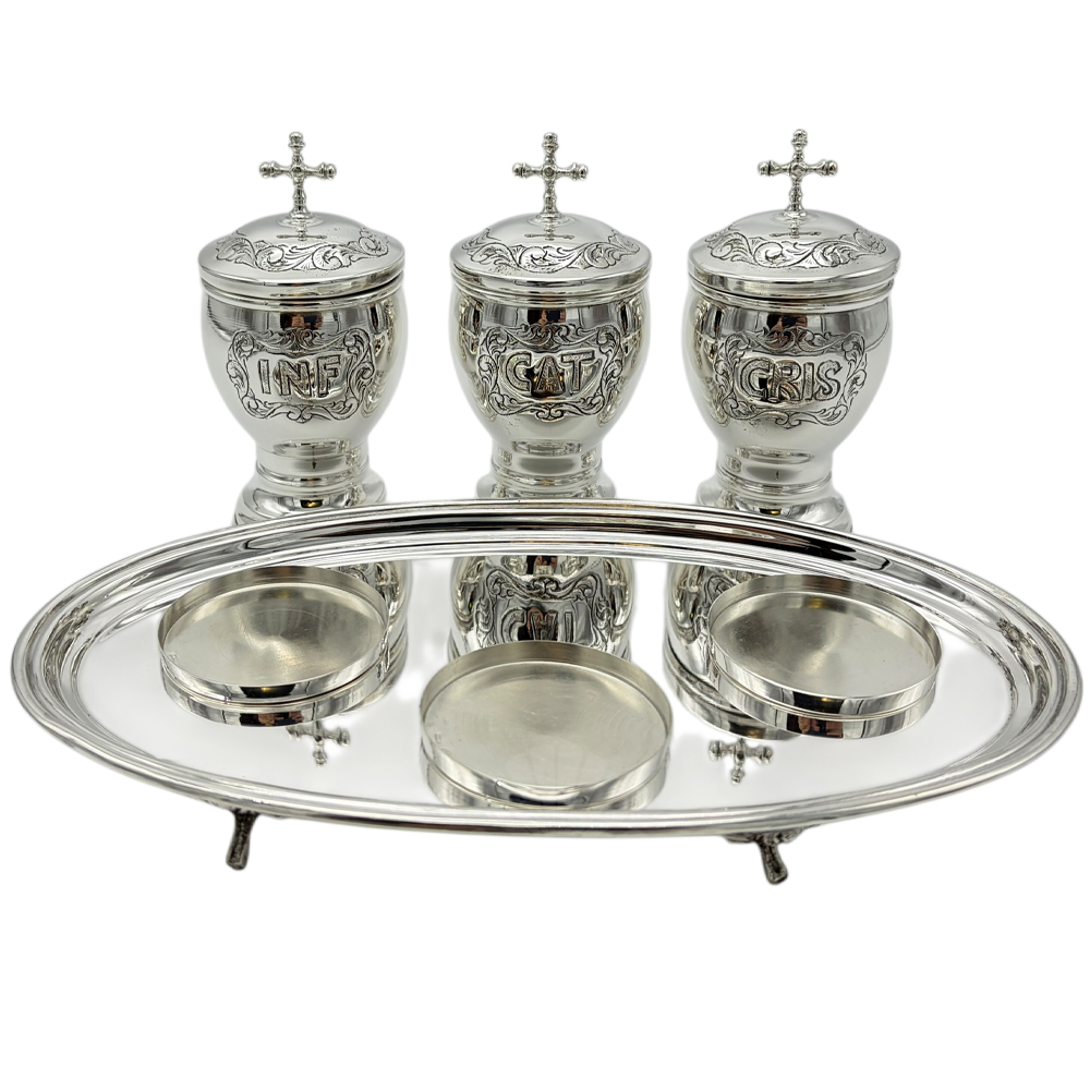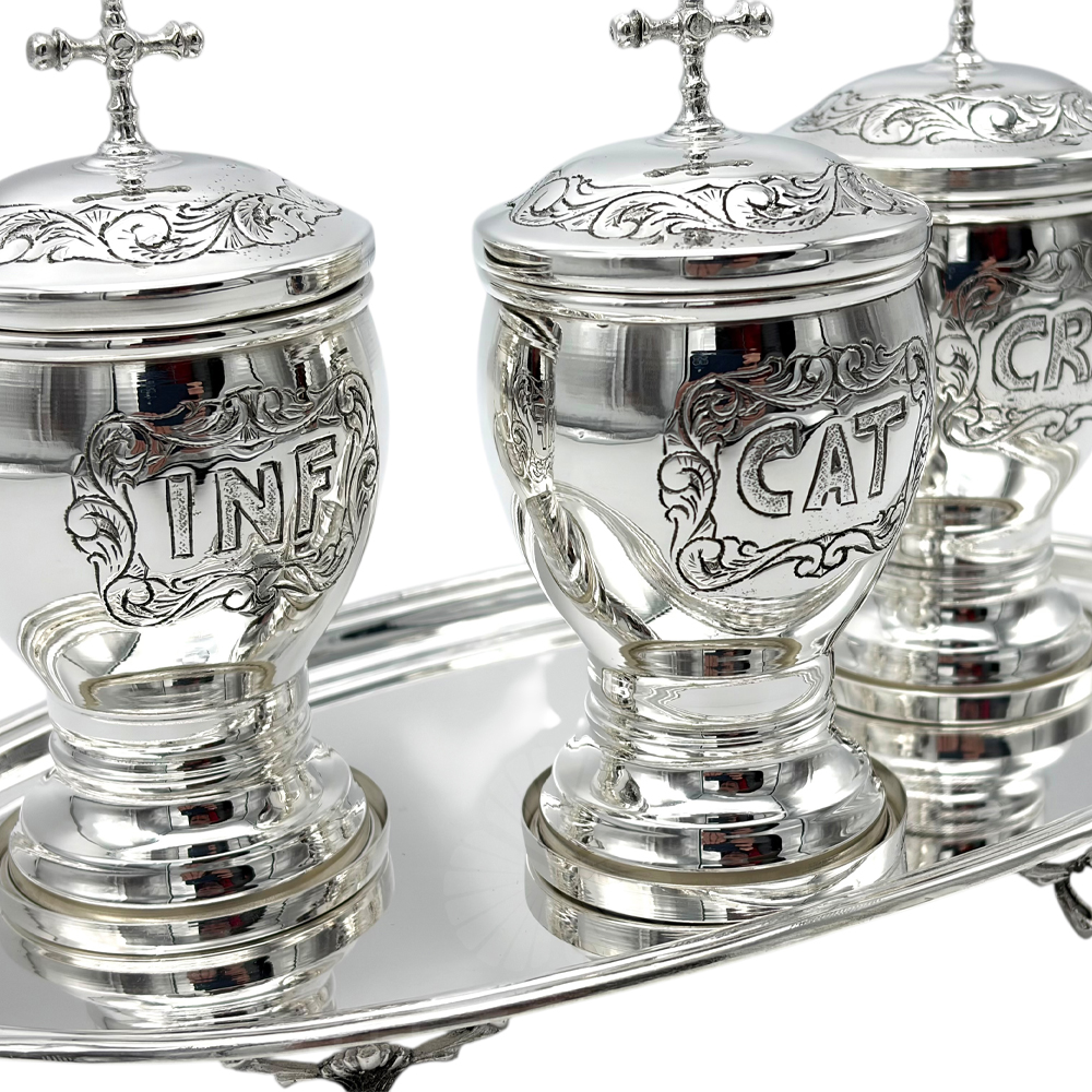 Crismeras con bandeja fabricadas en plata.
