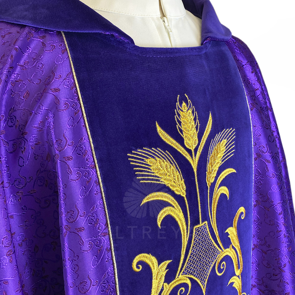 Casulla elaborada con tela damasco y estolón de terciopelo con bordado en hilo de oro.