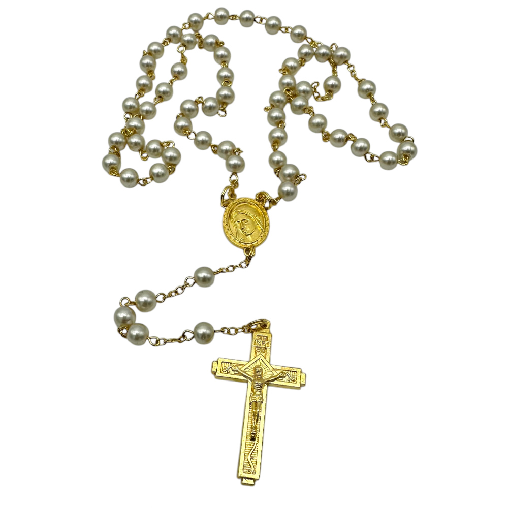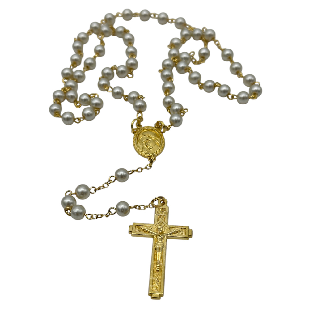 Rosario fabricado con cuentas de 6 mm en imitación perla y metal dorado.